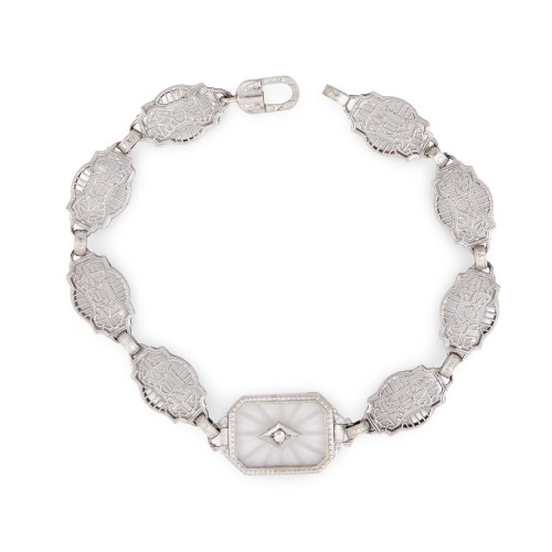 Art Deco 14k Rock Quartz Crystal & Diamond Belly Line Bracelet