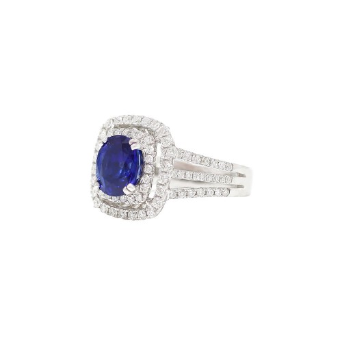 18K White Gold Round Blue Sapphire Center With Double Diamond Halo & Triple Split-Shank Ring