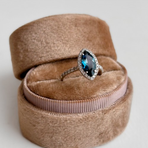 18ct White Gold 1.67ct Earth Grown Marquis London Blue Topaz & Diamond Ring UK M1/2