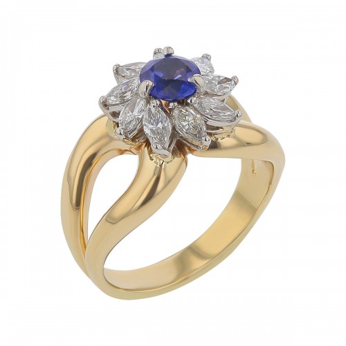 0.69ct Round Ceylon Sapphire and 0.63ct Marquise Diamonds Halo Ring in Platinum and 14k Yellow Gold, Size 6
