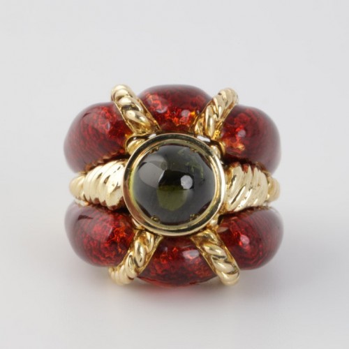 Bold and richly detailed, this 14k yellow gold statement ring features a vibrant arrangement of round citrine gemstones paired with a mosaic of multicolored mother of pearl. The warm orange tones of the citrine contrast beautifully with the iridescent shell inlay, creating a dynamic, eye-catching design. Crafted in size 6 and weighing a substantial 12.00 grams, this ring offers strong presence with refined craftsmanship.