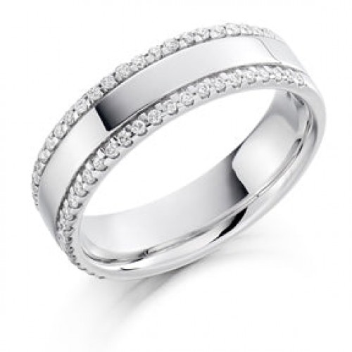 Micro-claw set, 3 row, 51x brilliant cut diamond 5.8mm wide Half Eternity Ring. 50% diamond coverage, total diamond weight 1.05ct, Colour G-H, Clarity SI Available in 9ct, 14ct & 18ct Yellow, White or Rose Gold, Platinum and Palladium Please contact us before placing your order to discuss the size required and delivery timeframe.