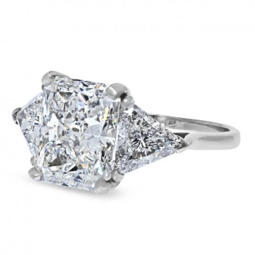 5.56 carat three stone radiant cut ring mounted with a GIA certified G color VS2 clarity diamond, flanked by (2) trilliant cut diamonds of 1.95cts in total weight.