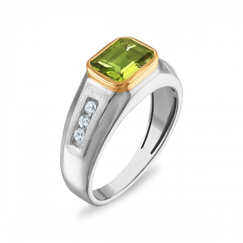 Make a bold and refined statement with this distinguished men’s ring, featuring a striking 9X7MM emerald-cut green peridot at its center. The vivid, fresh hue of the peridot is beautifully framed in 10K yellow gold, creating a luxurious contrast against the polished sterling silver band. Adding brilliance to this elegant design are six sparkling white sapphires, three set on each shoulder, enhancing the ring’s sophisticated style. This two-tone piece effortlessly combines strength and elegance – perfect for the man who appreciates classic design with a modern edge.