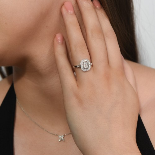 Expertly crafted with platinum, this ring features a stunning 0.70ct laboratory grown emerald cut diamond at its center. The elegant design is enhanced by a halo of 0.29ct round diamonds, accented with a delicate milgrain edge. Sophisticated and sustainable, it’s a true statement of luxury.