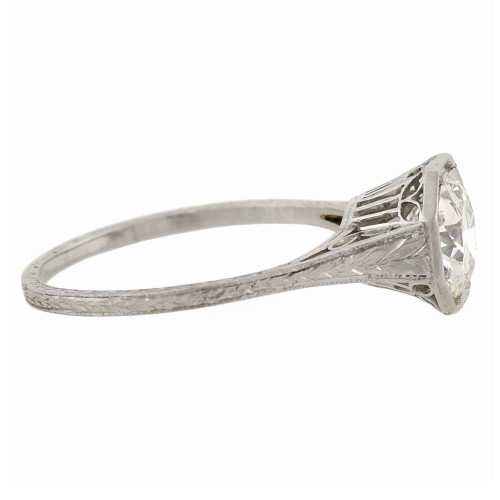 A stunning diamond engagement ring from the Art Deco (ca1920s) era! This beautiful piece is crafted in platinum and features a sparkling old European Cut diamond prong set within a fantastic octagonal shaped box setting. The stone weighs approximately 1.35ct and displays H/I color with VS2 clarity, catching the light beautifully with every turn. A fine flowing wirework design graces the entire mounting, complete with lacy cutouts, adding a lovely feminine touch and a soft wheat motif lines the shoulders and every edge of the band, which graduates slightly towards the back. The ring was appraised by an independent and accredited GIA-certified Graduate Gemologist in June 2020, and has a stated retail replacement value of $15,000.00. A visual masterpiece from all angles, this gorgeous piece would make a stunning engagement ring!