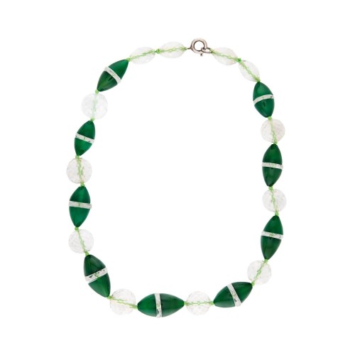 A colorful beaded necklace from the Art Deco (ca1920s) era! This gorgeous piece is comprised of a strand of alternating chrysoprase and rock quartz crystal beads. The conical-shaped chrysoprase beads are separated by faceted rock quartz crystal spacers, but display a deep, vibrant green hue. The sphere-shaped rock quartz crystal beads are wonderfully faceted, and catch the light with every turn. The end of each side of the necklace features 2 additional conical-shaped rock quartz crystal beads. All of the beads are individually knotted and strung on lime green thread. The necklace secures with a simple sterling silver spring ring clasp. A bold piece, this necklace would make a fantastic addition to any Art Deco-era jewelry collection!