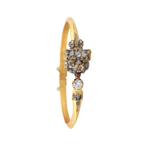 A stunning bangle bracelet from the Art Nouveau (ca1900s) era! Crafted in 14kt yellow gold, this bangle adorns three glowing Boulder Opal cabochons and two Full Cut diamonds. The opals emit a beautiful rainbow full of reds, yellows, greens, blues, and the rich brown natural inclusions, classic of boulder opals. The opals and diamonds rest within bezel settings, and the bangle bracelet is adorned with gorgeous nature-inspired engraving. The diamonds rest at the center of engraved flowers, and curling flora decorates the outside of the bangle. The inside of the bracelet is stamped with “14KΨ”. A gorgeous bracelet, it looks beautiful on its own or paired with complementary pieces. It would be a wonderful addition to any Art Nouveau collection!