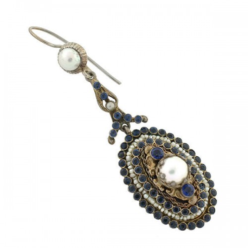 An incredible pair of Austro-Hungarian earrings from the Arts & Crafts era (ca1930)! Made of sterling gilt, these gorgeous earrings are comprised of ornate oval links which hang from a decorative surmount. Each oval is encrusted with rows of delicate natural seed pearls and bezel-set faux sapphires. Resting in the center is a prong-set pearl accented by two faux sapphires, which sits atop a swirled mourning surrounded by fine chain. The oval links hang from an elongated link that forms the surmount, decorated with a pearl and sapphire design. At the top of each earring is a bezel set pearl attached to a simple earring wire, though they could easily be converted to posts if desired. The faux sapphires have an authentic deep blue color and compliment the lustrous white pearls perfectly! A lovely etched floral design enhances the reverse side of each earring, characteristic of the Austro-Hungarian style of craftsmanship. A simply spectacular pair of Austro Hungarian earrings, they make a beautiful statement when worn and would be a wonderful addition to any collection!