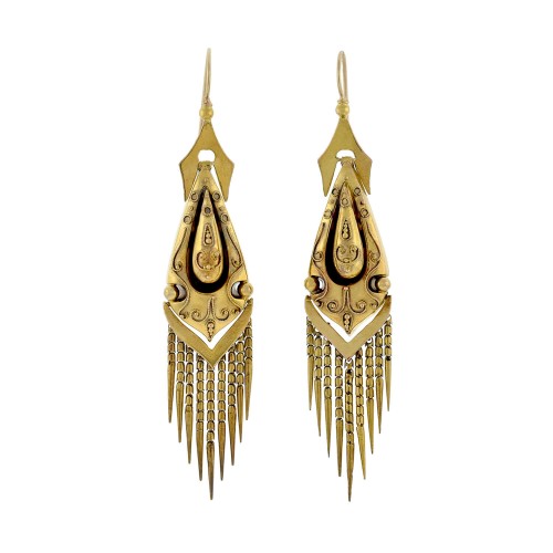 A striking and unique carved ivory and pearl pendant from the Arts and Crafts (ca1910) era! This gorgeous piece is substantial in size and adorns a large hand carved ivory plaque held within a 14kt yellow gold frame. The oval-shaped plaque features an intricately carved design on the front surface depicting a fantastic mythical creature that curves around with its head resting near the center. The creature is embellished with two darkened eyes, a pointy tongue, and the surrounding scene features incredible texture, adding wonderful dimension to the design. The bezel set plaque is held within an ornate frame, which is decorated with swirled wirework that alternates with textured leaf motifs. Six gorgeous freshwater pearls are symmetrically set along the frame, exhibiting a high surface luster and a rich creamy white color. The combination of the carved ivory next to the ornate yellow gold frame is exquisite. A large fluted bail rests at the top and a bar pin and secure clasp (stamped with a “14K” gold purity mark) is attached at the back, allowing the piece to be worn on a favorite chain or garment. This magnificent piece makes a fabulous statement piece when worn and would make a stunning addition to any collection!