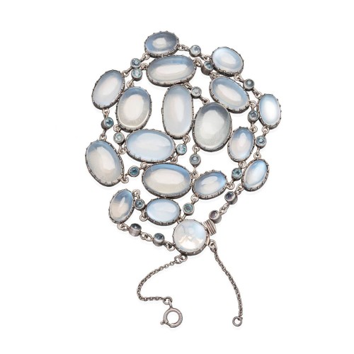 A stunning moonstone necklace from the Arts & Crafts era (ca1910s)! This incredible piece is crafted in sterling silver and comprised of stunning moonstone and blue zircon links. The necklace displays a moonstone chain, graduating slightly in size, with the largest set in the center. Each is oval in shape and prong set and alternates with small, bezel-set zircon stone spacers. The moonstones have a wonderful translucent quality with vibrant blue flashes which look stunning when paired with the deep blue color of the zircon stones. The necklace fastens at a hidden clasp which is incorporated into the design and there is a clasped safety chain for added security. This magnificent necklace drapes beautifully along the neckline when worn and is a wonderful example of Arts & Crafts era jewelry!