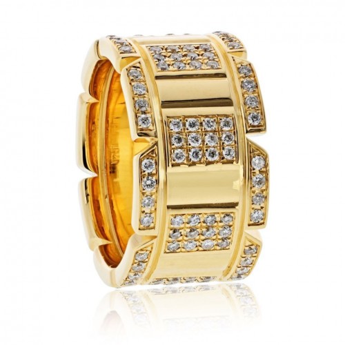 A striking Cartier Tank Française ring in rich 18K yellow gold, featuring an 11mm wide silhouette accented throughout with sparkling round diamonds totaling approximately 2.00 carats. The clean, structured design echoes the unmistakable Tank Française aesthetic, blending strength, symmetry, and brilliance in one powerful statement ring. Timeless yet contemporary, this piece elevates everyday wear with unmistakable Cartier presence.