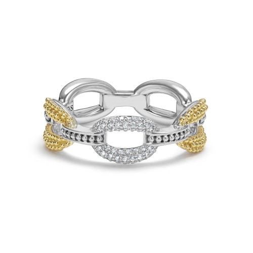 18k gold and sterling silver variations of Caviar beading & fluting elements accented by diamonds form this oval link ring. LAGOS diamonds are the highest quality natural stones.