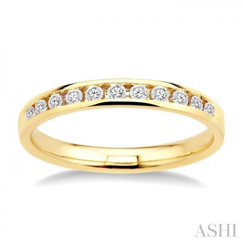 Start your new life together with this elegant wedding band. Crafted in 14 karat yellow gold, this classic band features 11 sparkling channel set round cut diamonds in a semi-circle. reflecting brilliant flashes of light from diamonds are like the melody of your romance to her heart always. The total diamond weight is 1/4 Ctw.