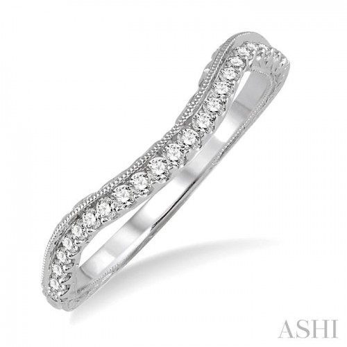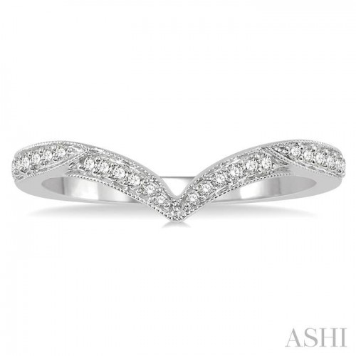 A charming design and skilled craftsmanship are the highlights of this beautiful diamond wedding band. The shank features pointed tips, from where extended arms spring out and curve down in the middle, to form a deep cut V-shape center. 12 pave set round cut diamonds adorn the indented V-shape center accent, while another 12 pave set round cut diamonds, 6 on either side, fill the shank up to its pointed tips. A milgrain border highlights the design of the wedding band, which is crafted in 14 karat white gold. Total diamond weight is 1/6 Ctw.