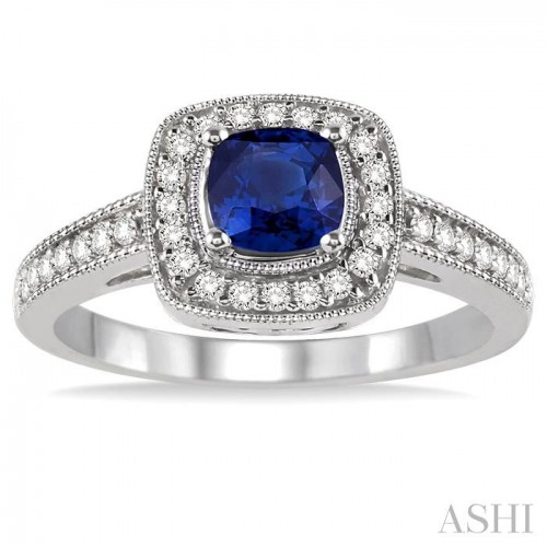 Add a pop of color to her ensemble with this vibrant Sapphire and diamond ring. The center of the ring blazes with a brilliant prong set cushion shape Sapphire that is surrounded and accentuated with shimmering 34 round cut diamonds, elegantly prong set on glistening 14 karat luminous white gold. The total diamond weight is 1/4 Ctw and Sapphire measures 5×5 MM.