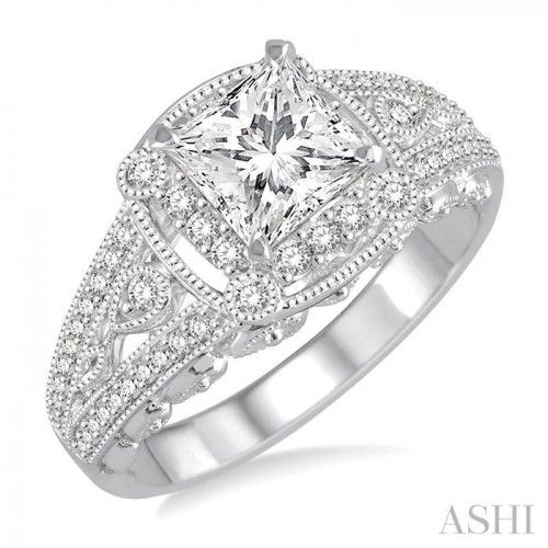A fabulous semi-mount diamond engagement ring, this offers aesthetic appeal. It also lets you choose a center stone for it as per your budget. The ring features a cushion shape center mount, with a 14 karat white gold prong raised middle, where a 0.85 Ctw to 1.20 Ctw 6x6MM cushion cut center stone of your choice is housed. Pre-embellished is 20 on the middle border and 34 on the lower, prong set round cut diamonds. Decorating the split cathedral shank are 18 each prong set round cut diamonds, total 36. An arch in the ring interior is accented with 19 each, total 38, prong set round cut diamonds at the front and back. The semi-mount ring is styled in 14 karat yellow and white gold. Total diamond weight is 3/4 Ctw.