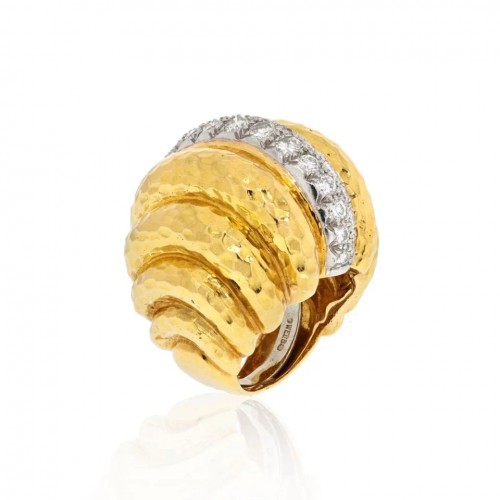 This is a fluted cocktail ring by David Webb in hammered 18k yellow gold, signed “Webb” for David Webb. Rows of hammered gold with a center section in platinum with pave set diamonds.