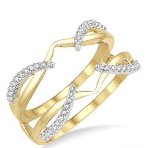 A stylish diamond insert ring, this adds volume and a decorative look to a simple or even a well-embellished ring. A mounted ring can also be worn with it, as the crown shaped arched center molds in with the mount, giving the ring wider appeal. Each ring is accentuated with a prong set round cut diamond in the center, flanked by 3 pave set round cut diamonds on either side, 14 in all on both rings. The shank is adorned with 8 pave set round cut diamonds each on either side, a total of 32 on both rings. The insert ring is framed in 14 karat white gold. Total diamond weight is 1/3 ctw.