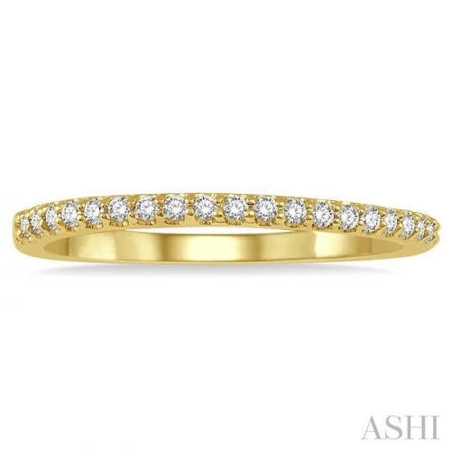 A lovely diamond wedding band, this offers a delicate look, highlighted by the sparkle of luminous diamonds. Simple but beautiful the ring can win hearts with ease. The wedding band features a neat row of round cut diamonds that line the ring top. There is a total of 22 pave set round cut diamonds decorating the band. The diamond wedding band is molded in a rhodium finish 14 karat yellow gold. The total diamond weight is 1/6 Ctw.