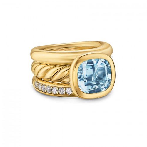 Sterling silver and 18-karat yellow gold • Sky blue topaz, 5.10 total carat weight, Stone, 10mm- Pavé-set diamonds, total carat weight ranges from 0.24 to 0.30 (dependent on size) • Ring, 14mm • Size 6