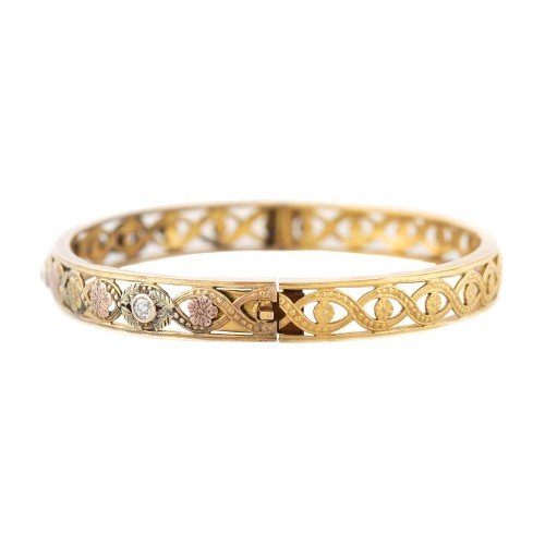 A beautiful mixed metal bangle from the Retro (ca1940s) era! Crafted in 12kt yellow gold , this bracelet features a spiraled floral motif with etched floral patterns and diamonds along the front of the bangle. The floral etching are crafted in a mix of rose, yellow, and green gold, lending an appearance of a colorful garden. There are three bezel set old European cut diamonds set among the flowers with a total weight of 0.30ctw. The bangle is hinged and can be opened from a small push clasp on the side. Gorgeous on its own or stacked with other gold bangle bracelets, this would be an incredible addition to any Retro lover’s collection!