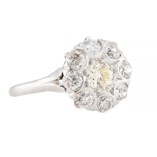 An absolutely lovely diamond cluster ring from the Edwardian (ca1910s) era! Crafted in 14k white gold, this ring features nine mine cut diamonds, which are arranged to represent a blooming flower. Overall, the stones have an approximate total carat weight of 1.40ctw. The central stone is slightly larger, and is bead set. The remaining 8 stones are held within prong settings. The shoulders and band of the ring are both smooth and simple. A delicate and feminine piece, this ring would make a unique engagement ring!