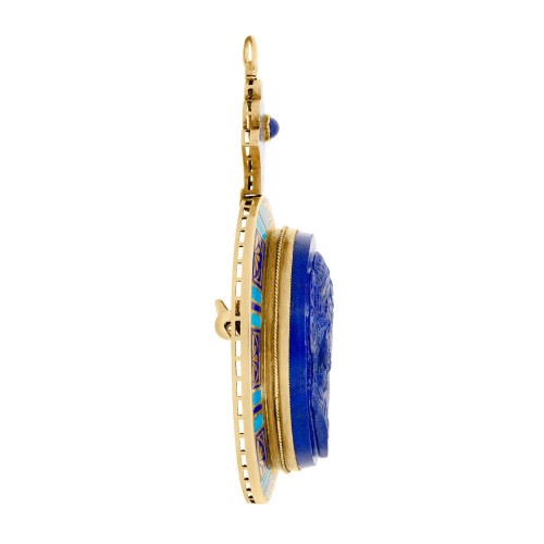 A stunning convertible pendant/pin from the Edwardian(ca1910) era! Set in 14k gold, this beautiful hand carved cameo depicts Roman style bust of a woman with flowing, curly hair and a laurel wreath atop her head. The cameo is carved in striking blue lapis and is surrounded by an intricately enameled border. The enameling alternates between beautiful deep cobalt blue and a bright turquoise color and is in excellent condition considering the age of the piece. At the crest of the cameo’s 14k border is a plumed setting, including additional enameling surrounding a bezel set lapis cabochon, with a gold jump ring allowing this piece to be worn as a pendant. The jump ring portion is hinged and can be folded back to convert the piece into a stunning pin, which would be secured by a hidden c-catch pin. It is a stunning piece and would make a great addition to any collection!