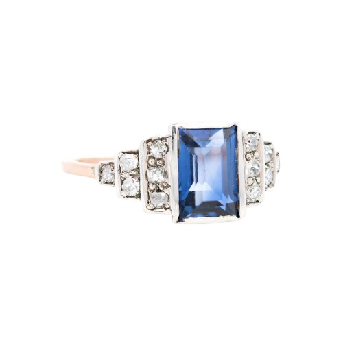 A beautiful sapphire and diamond ring from the Edwardian (ca1910) era! Made of platinum and 14k gold, this gorgeous ring has a lovely “step-up” style mounting. Three rows of platinum and diamond “steps” form the shoulders, framing a luscious 1.54ct blue Ceylon sapphire bezel set in the center of the ring. Resting on the steps of the shoulders are 12 sparkling diamonds in a delicate bead setting, the perfect accent to compliment the sapphire! These smaller diamonds weigh approximately 0.25ctw with J-K range color and VS-SI2 range clarity. Completing the elegant design is a simple rosy yellow gold band, which slightly tapers towards the back. The ring is accompanied by a GIA Sapphire Origin report, #2235057023, confirming that the center sapphire originated in Sri Lanka. This wonderful ring would look perfect worn on special occasions, or could make a unique gemstone engagement ring!