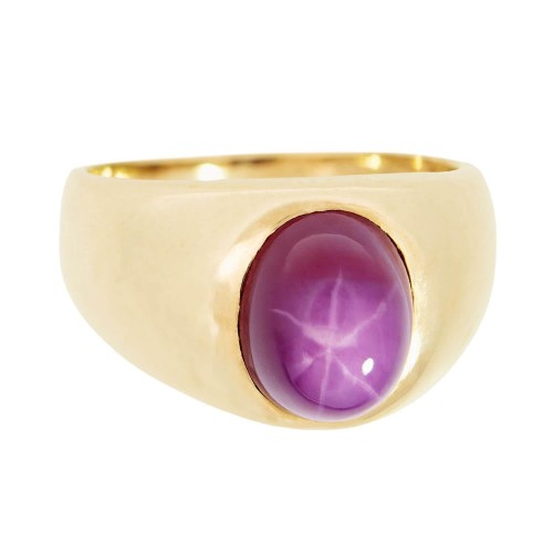 A beautiful star sapphire flush mount ring from the Edwardian (ca1910) era! This stunning ring has a flush-set star sapphire cabochon set amidst a classic gold flush mounting. The star sapphire displays a wonderful pinkish-purple hue, which creates a wonderful contrast to the gold mounting. The large stone has a carat weight of 2.5ct, and has not been treated with heat. The band is smooth and simple, and the inside of the shank is stamped with a “14K” purity mark. A classic piece with a colorful “pop”, this ring would make the perfect addition to any Edwardian jewelry collection!