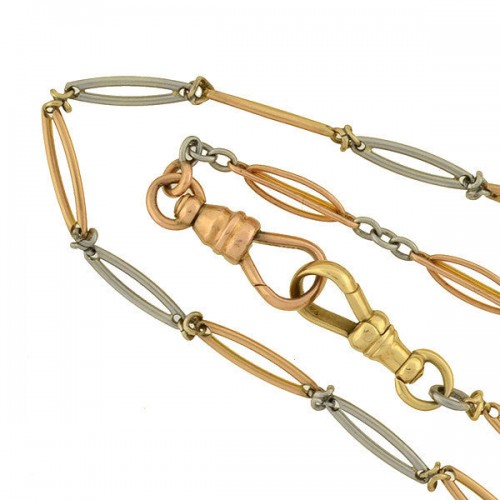 An exquisite chain necklace from the Edwardian (ca1910) era! This marvelous piece is comprised of 2 unique but complimentary watch chains which come together to form a single 24.5″ chain. The chain is comprised of open ellipse-shaped wirework links, which alternate between platinum and rose gold and the individual chains connect to each other at a large rose gold spring ring clasp as well as two 14kt gold watch swivel clasps. The clasps allow the wearer to easily add a complimentary locket, pendant or fob and could also be worn as a choker on a small neck. A spectacular piece, this magnificent chain looks striking when worn and would make an excellent addition to any collection!
