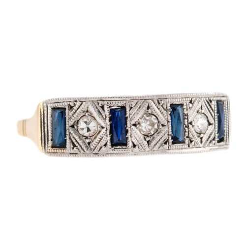 Condition: The overall condition of the ring is excellent. Besides normal surface wear, there is no apparent damage to the gold or platinum setting. All of the diamonds and sapphires are secure and intact.