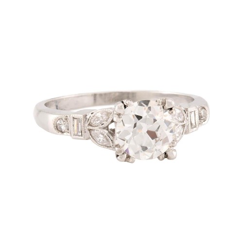 A stunning diamond engagement ring from the Edwardian (ca1910s) era! Crafted in 18k white gold and platinum, this ring features a 1.01ct old European cut diamond, which is held within a four-prong setting. The prongs are unique, and feature a three-clawed design. The diamond displays I color and SI1 clarity and is simply exquisite. The shoulders of the ring each feature 2 marquise cut diamonds, which are held within milgrained bezel-settings, and form a foliage-motif. Each shoulder also features an additional baguette cut diamond, which is held within a bezel-setting. Each shoulder is completed by a small single cut diamond, which is held within a four-prong setting. The complementary diamonds display H/I color and VS1-SI1 clarity. The remainder of the band is smooth and simple. The central diamond is accompanied by a GIA (Gemological Institute of America) Report #5231387419, which provides more information on the stone. An elegant ring, this piece would make an eye-catching engagement ring!
