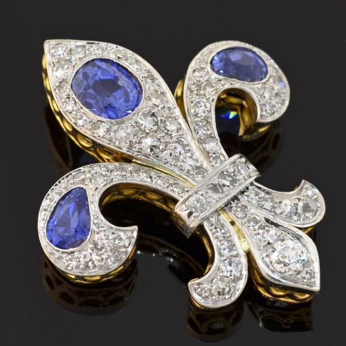 A spectacular fleur-de-lys pendant from the Edwardian (ca1910) era! This breathtaking piece is crafted in vibrant 18kt gold and topped in platinum, creating a lovely two-tone appeal. Covering the surface of the pendant is an array of sparkling pavé diamonds, which are set in platinum and have an approximate total carat weight of 1.25ctw. Set within each “petal” of the fleur-de-lys flower is a luscious Ceylon sapphire, adding a gorgeous pop of vivid blue. The natural no-heat sapphires are bezel set and beautifully faceted, weighing approximately 3.00ctw combined. The center stone is a Cushion Mine Cut, while the outer two Mine Cut sapphires are faceted into soft teardrop shapes. The back of the pendant reveals a hidden bail attached behind the tip of the fleur-de-lys, where a favorite chain can be threaded through seamlessly. A truly outstanding piece, it would look incredible worn on special occasions, and would make a magnificent addition to any collection of fine antique jewelry!