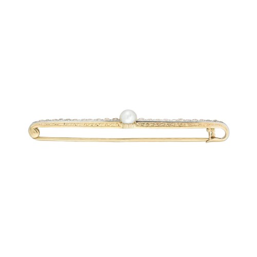 A beautiful pearl and diamond bar pin from the Edwardian (ca1910) era! Crafted in 18kt yellow gold and topped in platinum, this piece features 24 Old Mine Cut diamonds and a single white pearl. The diamonds graduate towards the center of the pin and weigh an approximate total of 3ctw. The pearl rests atop a scalloped base, and the body of the pin has a polished surface with lovely scrollwork detail. The pin clasp is secured by a hidden lever. It has a wonderful Edwardian look and would make a special addition to any collection!