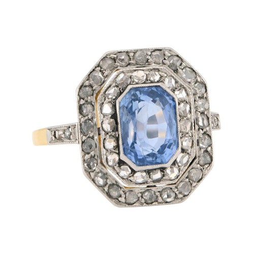 A truly gorgeous ring from the Edwardian (ca1910s) era! Crafted in 18k yellow gold and platinum, this ring features a central no heat 2.35ct emerald cut sapphire. The sapphire is held within a milgrained bezel-setting and displays phenomenal cornflower blue hue. The sapphire is surrounded by an octagonal-centerpiece, which is encrusted 1.20ctw of rose cut diamonds. All of the diamonds are held in place by bead-settings. Each shoulder of the ring features 2 additional rose cut diamonds, which are also bead set. The gallery of the ring is adorned with scrolling-motif etchings, and the gold band is smooth and simple. The inside of the shank features 2 small hallmarks, which depict an owl and a delicate flower. A fantastic piece, this ring would make a unique and colorful engagement ring!
