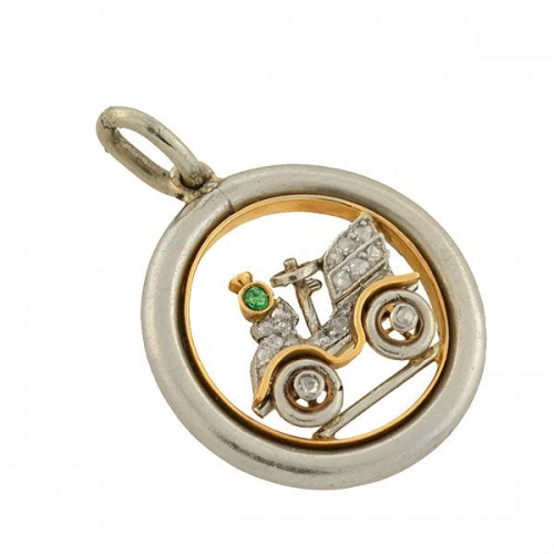 Edwardian Platinum/14kt Diamond Emerald Old Fashioned Car Charm Pendant