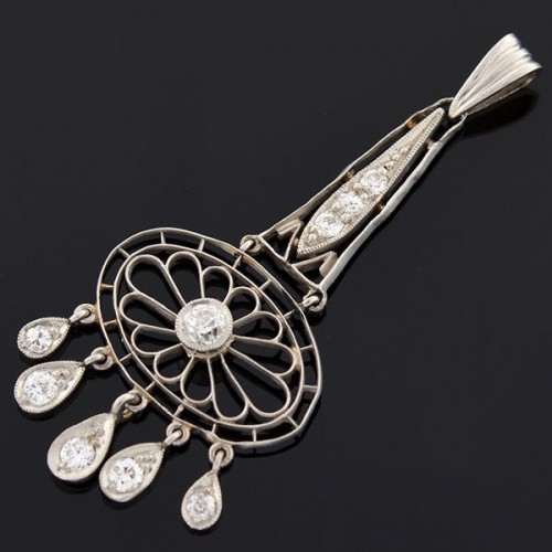 An absolutely stunning diamond pendant from the Edwardian (ca1910) era! The pendant, which has a wonderful ornate design, is made of platinum and detailed with soft milgrained accents and cutouts. At the center of the piece is a wide oval shaped link which has a flower-like cutout design in the middle. A bezel set old Mine Cut diamond acts as the center of the flower, weighing approximately 0.10ctw. The floral link hangs from a triangular shaped topper which has 3 old European Cut diamonds set in the center. Dangling from the bottom are 5 additional graduating diamonds which are set within a teardrop shape. The overall total weight of the pendant is 0.40ctw. The piece hangs from a simple bail which is perfect for attaching to a fine chain. The special piece looks beautiful on and would make a perfect addition to any collection!