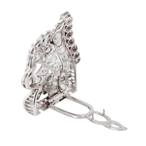 Condition: The overall condition of the clip is excellent. Besides normal surface wear, there is no apparent damage to the platinum setting or to the diamond encrusted design. All of the diamonds are intact, and the clamp fastens securely.