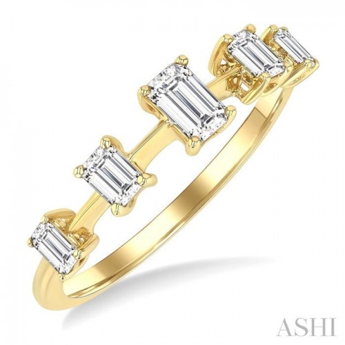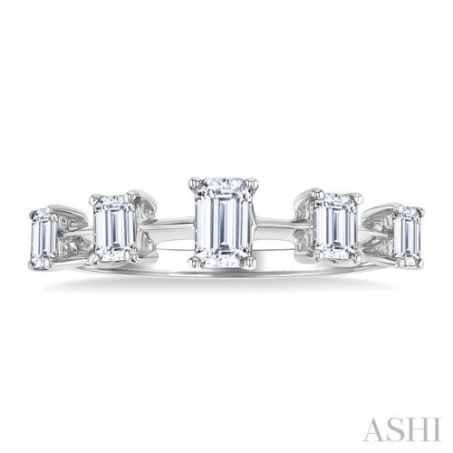 Traditionally given to celebrate milestones or anniversaries, eternity rings are a symbol of infinite love and unbroken commitment. Even a half-eternity band like this represents a love that endures forever, making it a meaningful and cherished gift. It features a graduated row of 5 meticulously set emerald cut diamonds, arranged at intervals for a captivating look. At the center, a striking 1/4 Ctw emerald cut diamond serves as the focal point, flanked by a 1/6 Ctw emerald cut diamond each. Completing the design is a 1/10 Ctw emerald cut diamond each, creating a tapered effect. The sleek lines of the emerald cuts combined with the warm glow of polished rhodium finish 14 karat white gold offer a modern aesthetic. Total diamond weight is 3/4 Ctw.