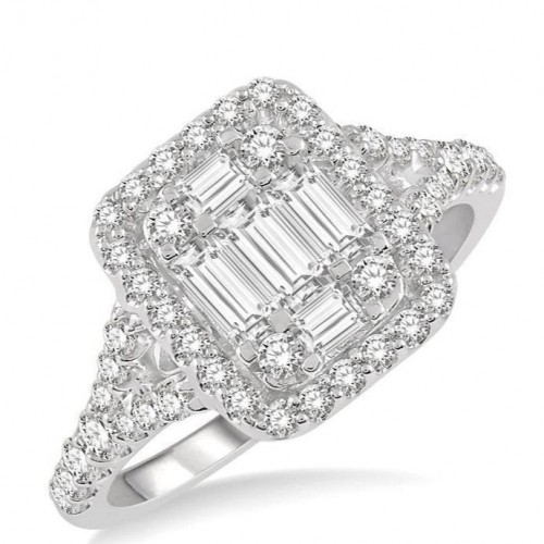 Minimalistic yet elegant, this diamond engagement ring catches the eye instantly. It features a beautiful centerpiece with a three-stone layout that offers great visual appeal. The centerpiece is a layered border setting, with a prong set 1/2 ctw emerald cut center stone on a high raised border in the middle. A prong set baguette diamond each flanks the center stone and is placed on a lower border than the main stone. A plain white gold shank completes the look. The engagement ring is styled in a polished finish 14 karat white gold. Total diamond weight is 5/8 ctw.