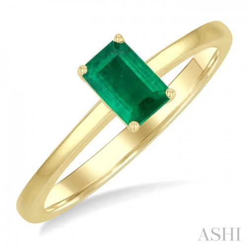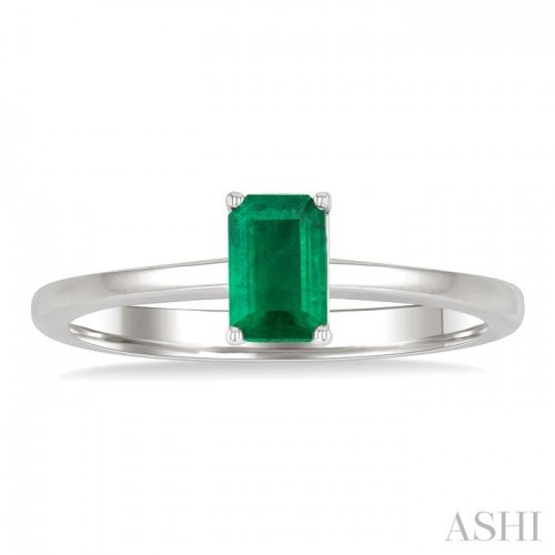Timeless and elegant, this solitaire emerald precious gemstone ring showcases a classic beauty with a modern sensibility. The ring centers on a striking 6X4MM emerald cut emerald, its clean, elongated facets capturing light in a soft, sophisticated glow. Set atop a sleek band of 14 karat white gold with a rhodium finish, the emerald stands alone in quiet confidence. The minimalist design lets the vivid green gemstone take center stage, making it a meaningful choice for those who appreciate refined simplicity and enduring charm.