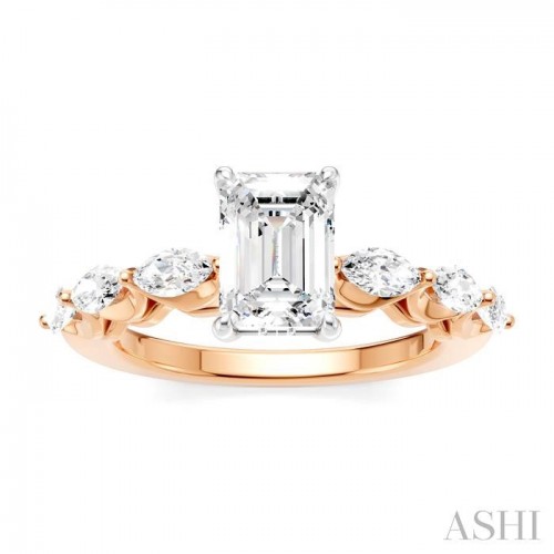 Begin a new chapter of your love with this exquisite semi-mount diamond engagement ring that offers a captivating blend of beauty and sophistication. It also gives you the freedom to choose a desired center stone, letting you the opportunity to create a ring that is as unique as your love, and ensuring that every glance at the hand serves as a reminder of the special bond you share. The ring features a 14 karat white gold prong-raised emerald-shaped center mount, where a emerald cut diamond ranging between 0.85 Ctw to 1.20 Ctw of your choice gets installed. Beautifying the shank are pre-decorated, 3 each fancy prong set marquise cut diamonds on either side, total 6 diamonds. 10 microscopic split prong set round cut diamonds embellish the gallery region. The semi-mount engagement ring is crafted in a rhodium finish 14 karat rose and white gold. The total diamond weight is 3/4 Ctw.