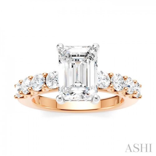 A charming semi-mount diamond engagement ring, this makes your proposal even more romantic with your personal touch added to it. The ring features a prong-raised emerald-shaped center mount, ready for a center stone of your choice. This should be a emerald cut diamond in the range of 1.65 Ctw to 2.35 Ctw. The shank comes pre-embellished with 4 each, 1/10 Ctw round cut diamonds on either side, adding to the elegance of the ring. Also, pre-adorning the gallery region are 14 microscopic split prong set round cut diamonds. A rhodium finished 14 karat rose and white gold offers luminous sophistication to the semi-mount diamond engagement ring. The total diamond weight is 7/8 Ctw.