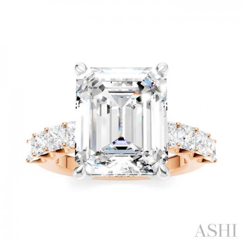 A charming semi-mount diamond engagement ring, this makes your proposal even more romantic with your personal touch added to it. The ring features a prong-raised emerald-shaped center mount, ready for a center stone of your choice. This should be a emerald cut diamond in the range of 3.65 Ctw to 4.50 Ctw. The shank comes pre-embellished with 4 each, 1/10 Ctw round cut diamonds on either side, adding to the elegance of the ring. Also, pre-adorning the gallery region are 14 microscopic split prong set round cut diamonds. A rhodium finished 14 karat yellow and white gold offers luminous sophistication to the semi-mount diamond engagement ring. The total diamond weight is 1 1/3 Ctw.
