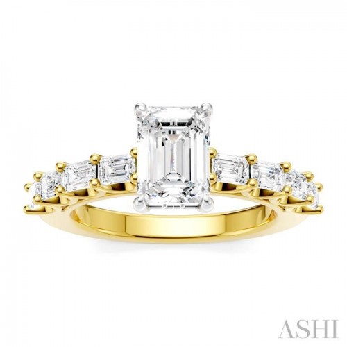 Mesmerize her with this stunning semi-mount diamond engagement ring, creating cherished memories for eternity. The icing on the cake is a customized center stone that reflects your personal style and preference. Showcased on the ring is a 14 karat white gold prong-raised emerald-shaped center mount, awaiting your chosen center stone, an emerald cut diamond between 0.85 Ctw to 1.20 Ctw. Pre-embellishing the shank are 4 each fancy prong set 1/10 Ctw emerald cut diamonds on either side. Enhancing the gallery region are 16 microscopic split prong set round cut diamonds. The semi-mount engagement ring is framed in a rhodium finish 14 karat yellow and white gold. The total diamond weight is 7/8 Ctw.