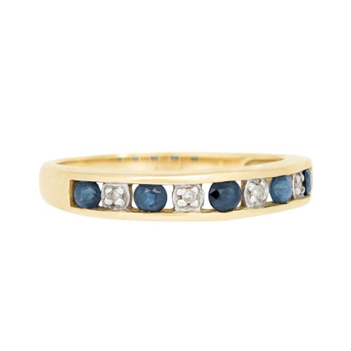 A beautiful sapphire and diamond ring! This stunning piece is crafted in 14k yellow gold, and has an alternating sapphire and diamond design that carries approximately half way around the band. The sapphires are round cuts and the diamonds are single cuts. The band has a total of nine stone running horizontally across the front of the band, which are held within floating channel settings. The remainder of the band is smooth and simple, and the inside of the shank is stamped “14K”. A delicate and dainty piece, this band would make the perfect addition to any collection!