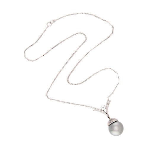 Condition: The overall condition of the necklace is excellent. Besides normal surface wear, there is no apparent damage to the white gold chain, and the pearl and diamond-encrusted pendant is securely attached. The spring ring clasp is in working order.