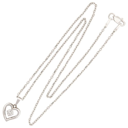 A lovely and romantic pendant necklace! This necklace is comprised of a 14k dainty cable chain, which secures with a lobster claw clasp, and is stamped “14K” and with a “W”. The chain is accompanied by a heart-motif pendant, which is crafted in 18k white gold. The heart is centered by a .25ct modern round brilliant cut diamond, which is held within a four-prong setting. The diamond displays H/I color and VS1-SI1 clarity. The top of the piece features a complimentary bail, which allows the pendant to easily glide along the chain. The backside of the pendant is stamped with a “750” purity mark. An elegant and timeless piece, this ring would make a fantastic gift for any loved one!