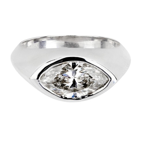 A marvelous diamond ring! Crafted in 18k white gold, this ring features a central “east-to-west” bezel set marquise diamond. The stone displays I color and VS2 clarity. The remainder of the band is smooth and simple. The ring was appraised in March of 2025 by a GIA certified appraiser, and has a stated retail replacement value of $30,000. The diamond is accompanied by a GIA (Gemological Institute of America) Report as well. A unique ring, this piece would make a fabulous engagement ring!